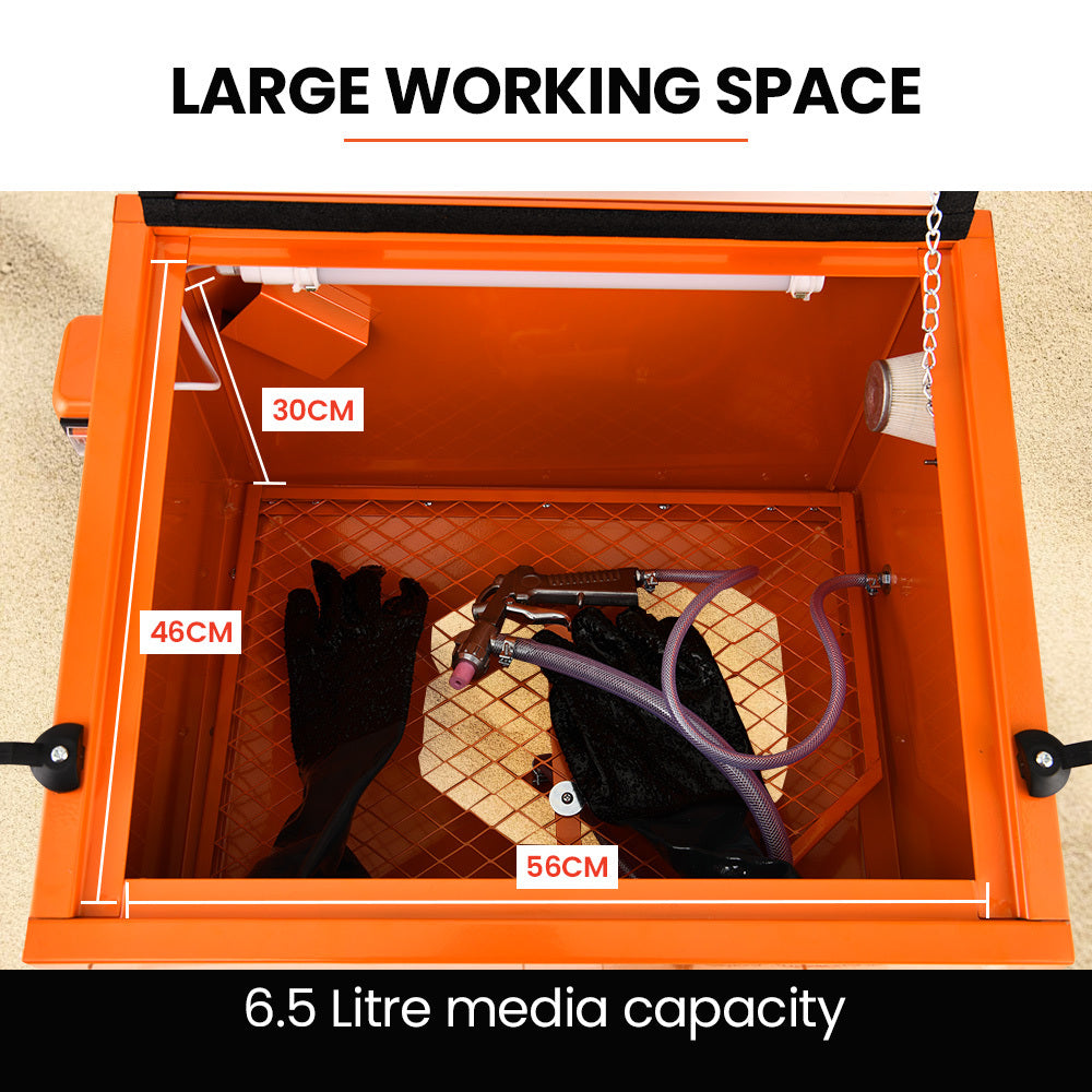 The moulded protective gloves ensure safe handling, while the internal LED light provides optimal visibility for your work. It includes 4, 5, 6, and 7mm nozzles, allowing for a wide range of blasting medium choices. Plus, with an operating pressure of 40 - 80 PSI with a minimum of 5 CFM, you can adjust the blasting strength to suit your needs.