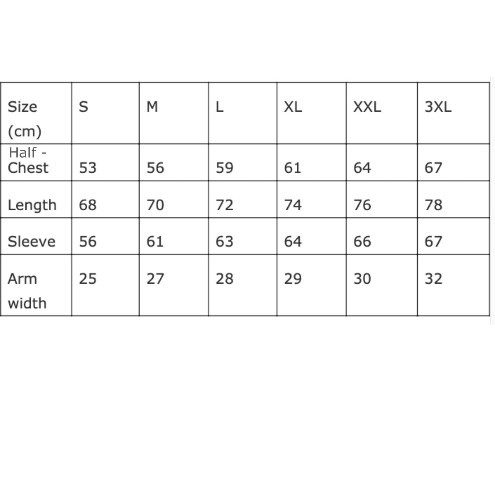 | Size (cm) | S | M | L | XL | XXL | 3XL |