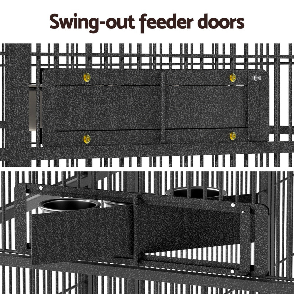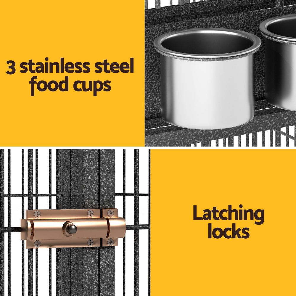 Give your large bird the space it needs to fly and thrive with the i.Pet Bird Cage. Our walk-in aviary is perfect for the care of large birds, reptiles or even as a temporary shelter for your family dog. Made from durable wrought iron with a protective coating, this cage ensures long-lasting use and resistance against rust and corrosion. The cage features a large walk-in door for easy access and simple cleaning. The swing-out feeder doors and three stainless steel food cups provide a convenient feeding solution, so you can feed your pets without entering the cage. With latched locks, your pets will be safe and secure inside the cage. The aviary is perfect for large birds like parrots, macaws, and cockatoos, offering them ample space to move around and exercise throughout the day. Give your pets the ideal home with the i.Pet Bird Cage.