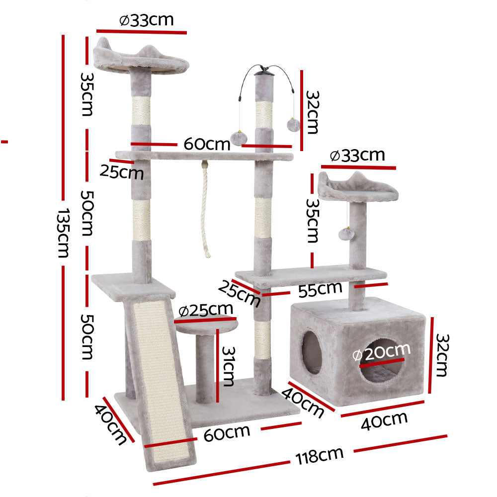 Cat Tree 135cm Tower Scratching Post Scratcher Wood Condo House Toys Grey