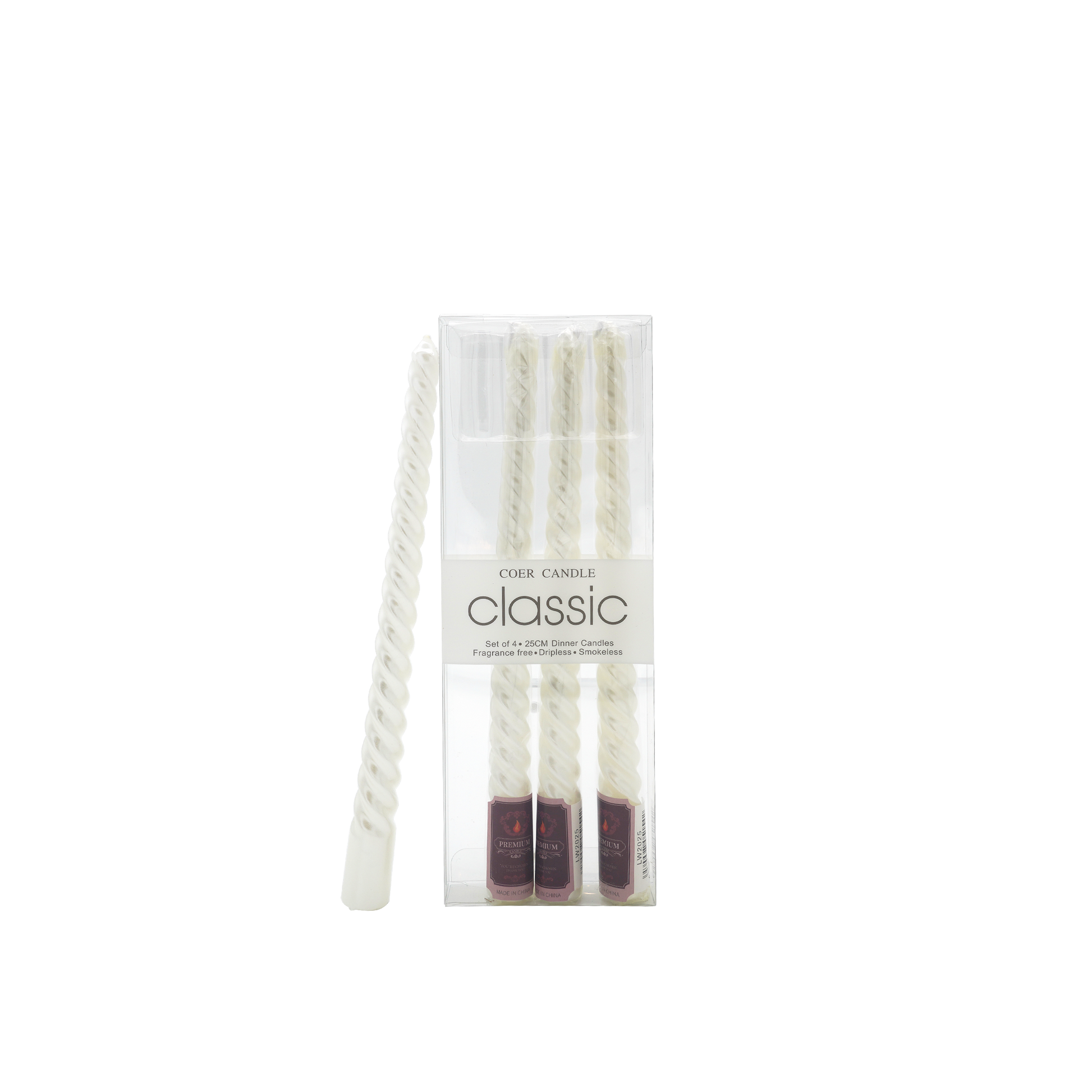 A dance of smooth lines, this classic candle with classic shapes, makes for a traditional decorative accent. Fashioned entirely of wax, this piece has a cylindrical shape with the choice of smooth texture or spiral pattern. This piece will be a stunning decorative accent with any candle holders on a console, side table, or bookshelf, diffusing an inviting glow into any room.