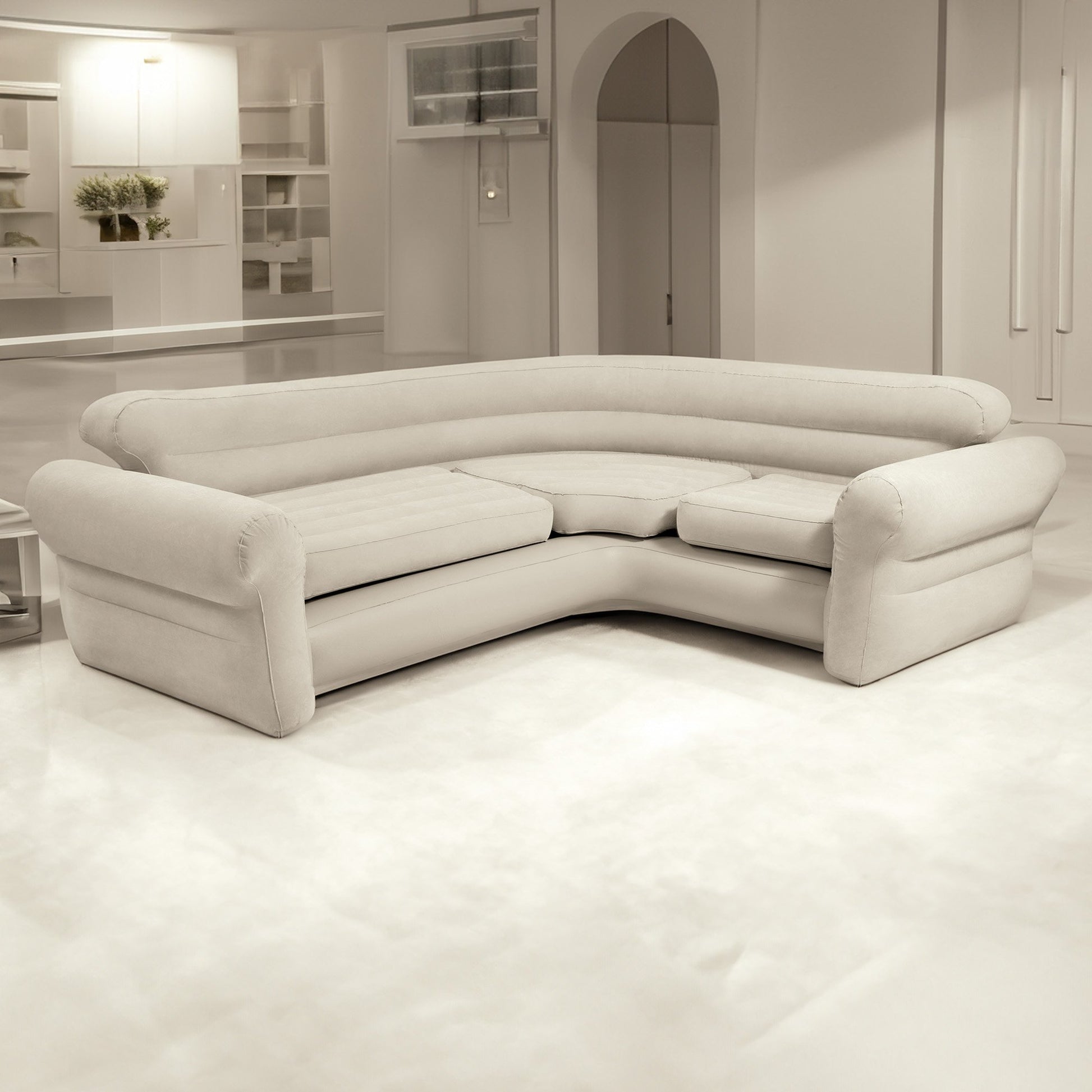 Chic, unique and undeniably comfortable, the Intex inflatable L-shaped couch is a beautifully designed piece thats luxurious yet convenient. Perfect for creating a cosy and intimate atmosphere in any corner of your residence! Its contemporary contoured design, broad armrests and generously sized cushions comfortably accommodate a family of four, all wrapped in an elegant beige finish.