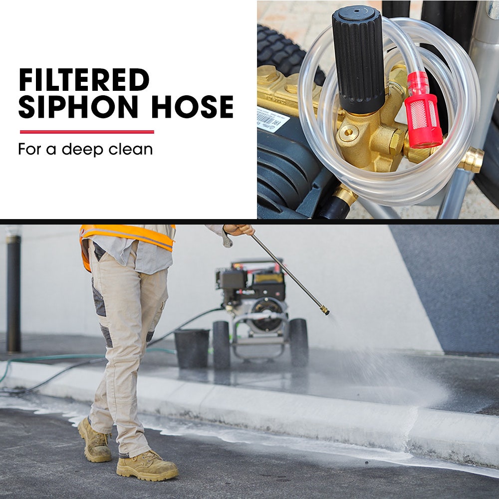 The hose is reinforced with industrial wire braiding and the generous 20 metre length reaches every inch of that roof or long driveway, all whilst maintaining huge pressure to get the job done. With rugged 13x5 oversized no flat wheels and strong yet lightweight balanced tubular frame you can easily work your way around the job site. The frame also features a removable top handle section that ensures that both transport and storage is easy.