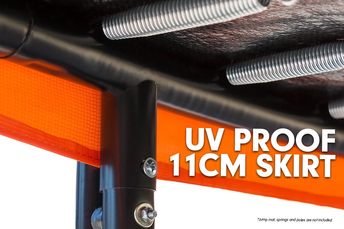 The pad is fitted with an 11cm PVC skirt which hangs down over the frame. This assists in locating the padding and also improves the appearance of the trampoline.