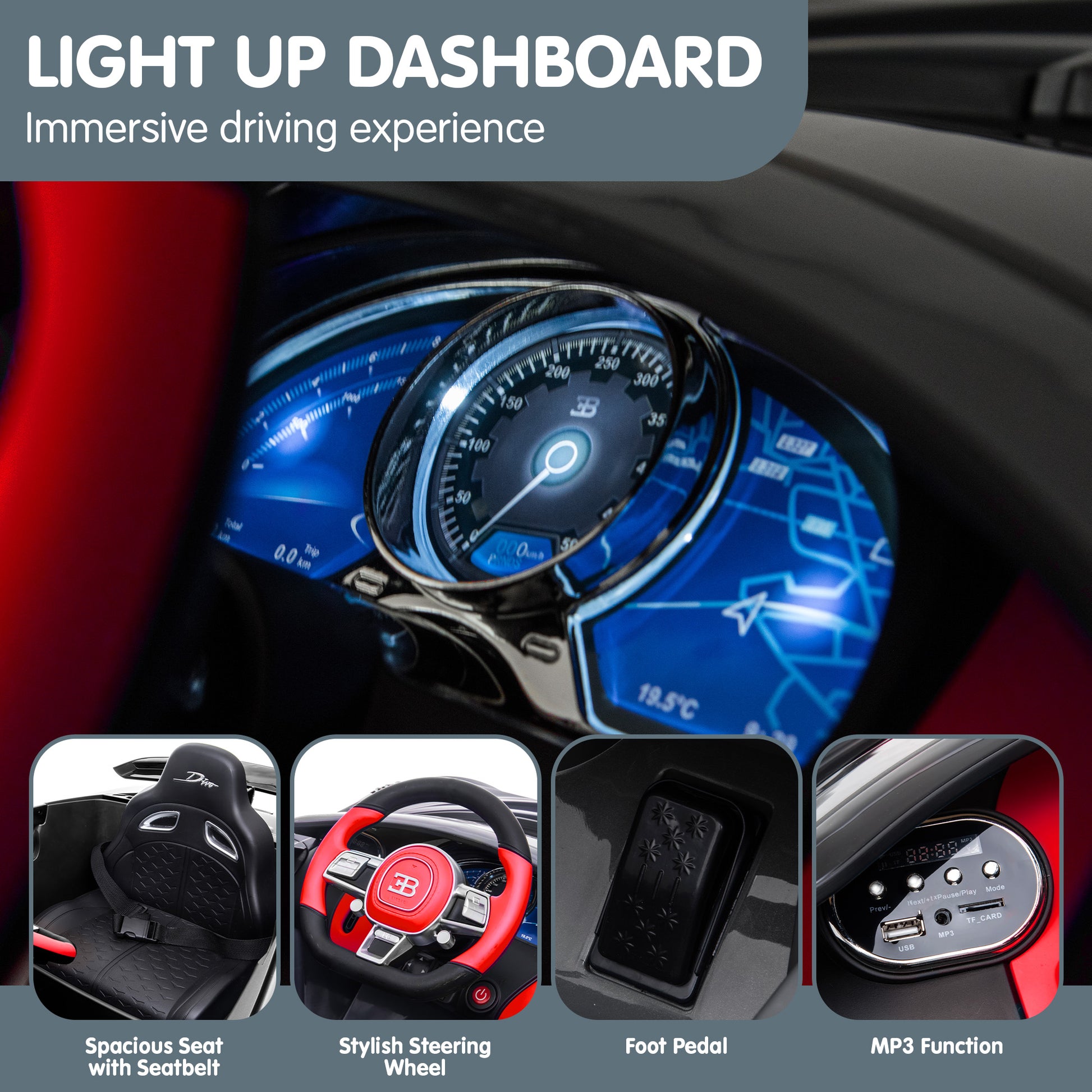 Interactive elements such as the press-to-start button, power display and music volume controls add excitement to the adventure. This ride-on, with SAA-certified cables and a high-end design, is perfect for kids ages 3 to 8, combining thrill with safety for a joyous neighbourhood cruise.