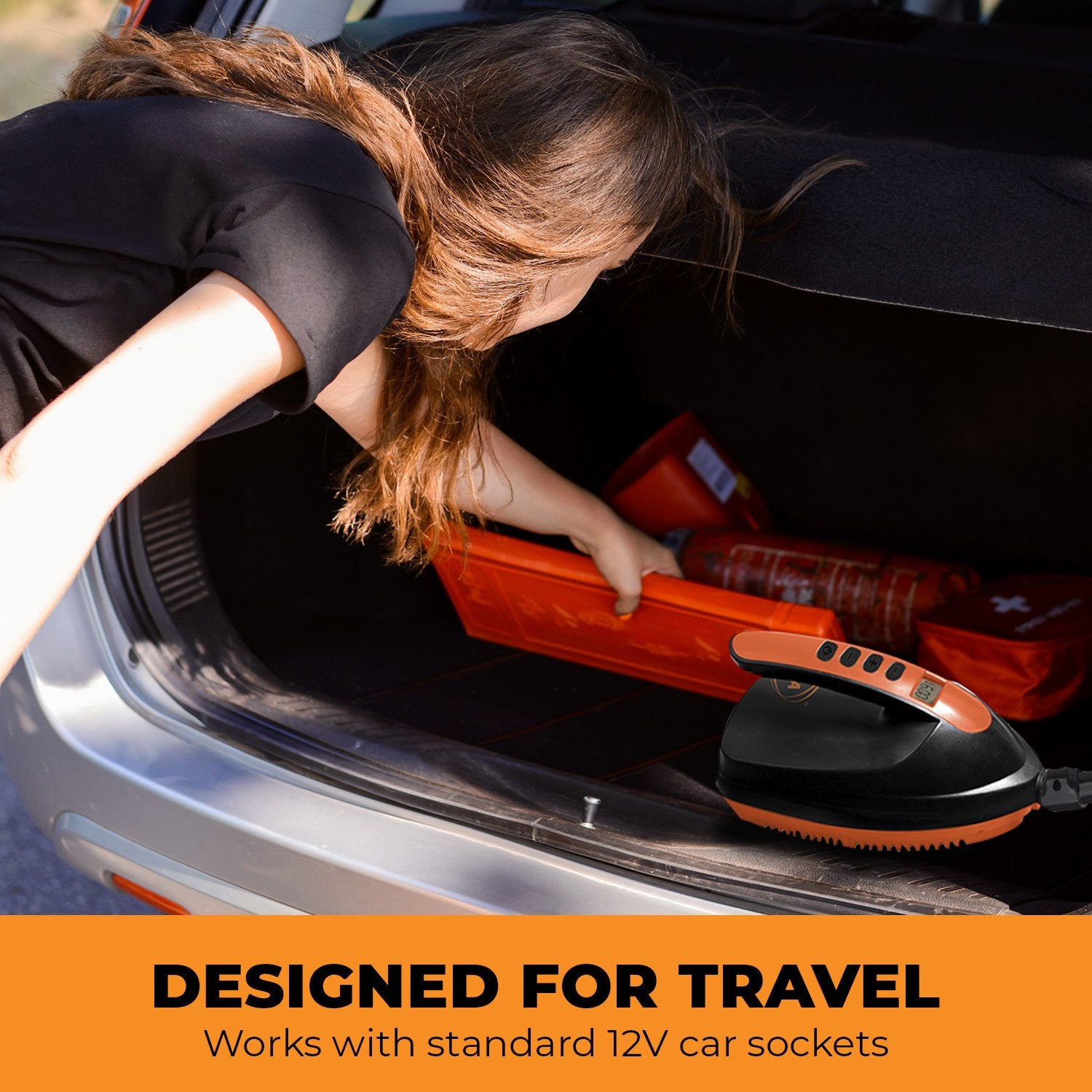 This lightweight portable air pump also has built-in cooling vents, a detachable hose, easy controls and non-slip rubber feet, making it perfect for travels.