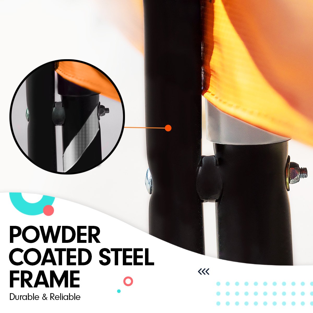 This is a heavy trampoline and uses linked legs and grounding straps for superior stability. The structure of the legs also minimises the tendency for legs to dig into the ground. Legs also feature re-enforced joint bars to enhance strength and stability.