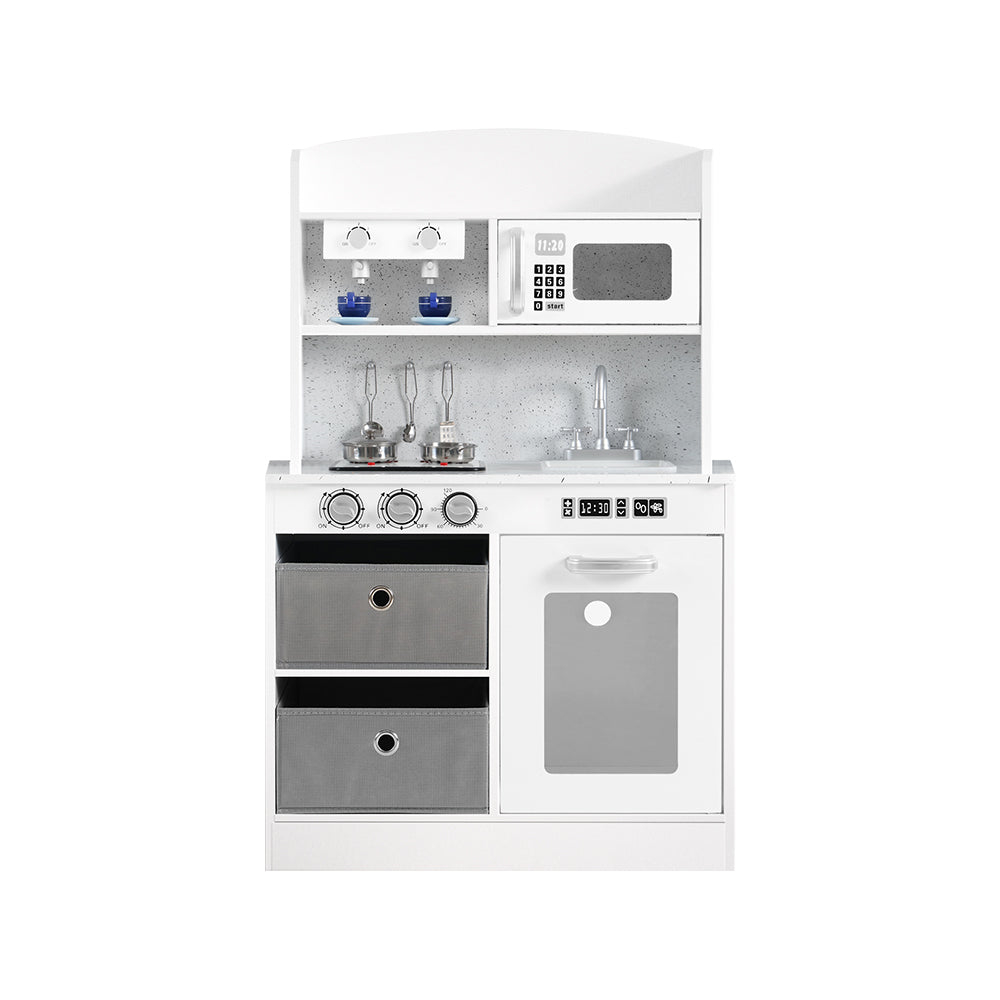 Every little aspiring cook needs their kitchen set! Let your little ones have fun cooking with our Keezi fully equipped modern kitchen play set. Our kitchen set comes with all modern kitchenware and appliances. It has a coffee machine, microwave, storage cabinet, tap and sink, stove top and play pots, oven with working knobs and door, and handy pegs and utensils for a real-like cooking experience. Made from a combination of solid wood and MDF, the kitchen set is sturdy and durable. It comes with safety and quality approval and non-toxic paint finish for your child’s safety. Now your young chefs can develop several basic life skills all while cooking and serving delicious meals for you. Go and get your kids in the Keezi kitchen today.