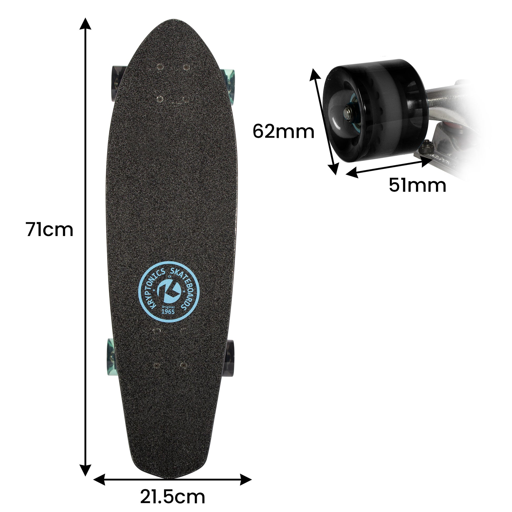 Cruise the streets like a boss with the Kryptonics 28 Negative Cruiser Board. Featuring a sleek top graphic and a spacious 28 x 8 deck, you will cruise in comfort with great control and a sense of flair. Keep your moves smooth and precise with the single kicktail and cruiser shape, while the sturdy 8 ply NE birch deck and clear sand spray grip ensure the board provides awesome durability and traction. Take your skating to new heights with the rad Kryptonics 28 Negative Cruiser Board!