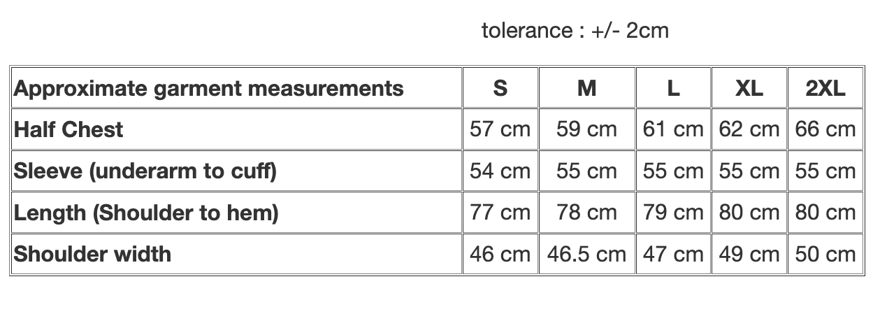 | Sleeve (underarm to cuff) | 54 cm | 55 cm | 55 cm | 55 cm | 55 cm |