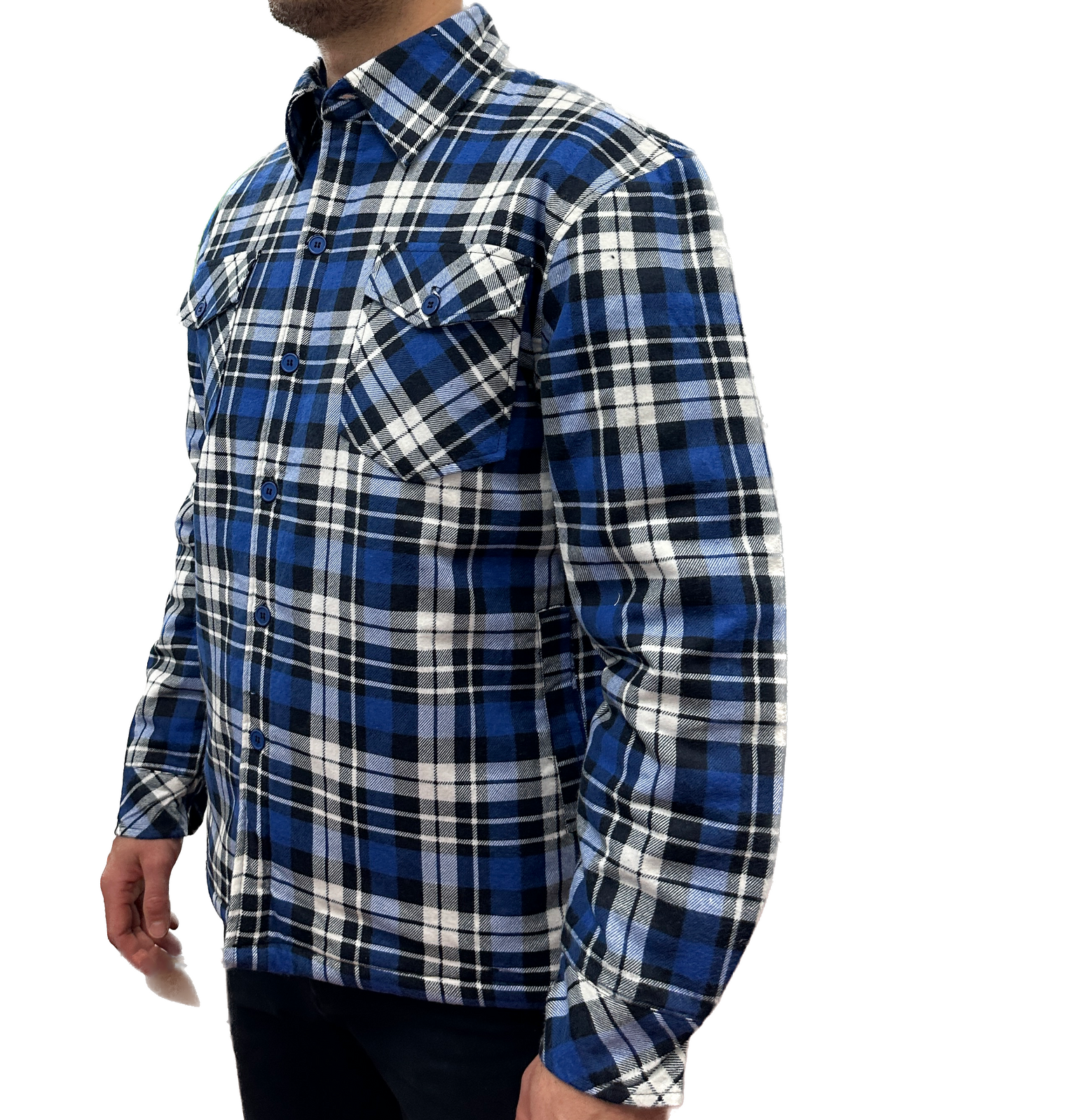 Mens QUILTED FLANNELETTE SHIRT 100% COTTON Flannel Jacket Padded Long Sleeve - Black/Navy/White (Quilted) - S