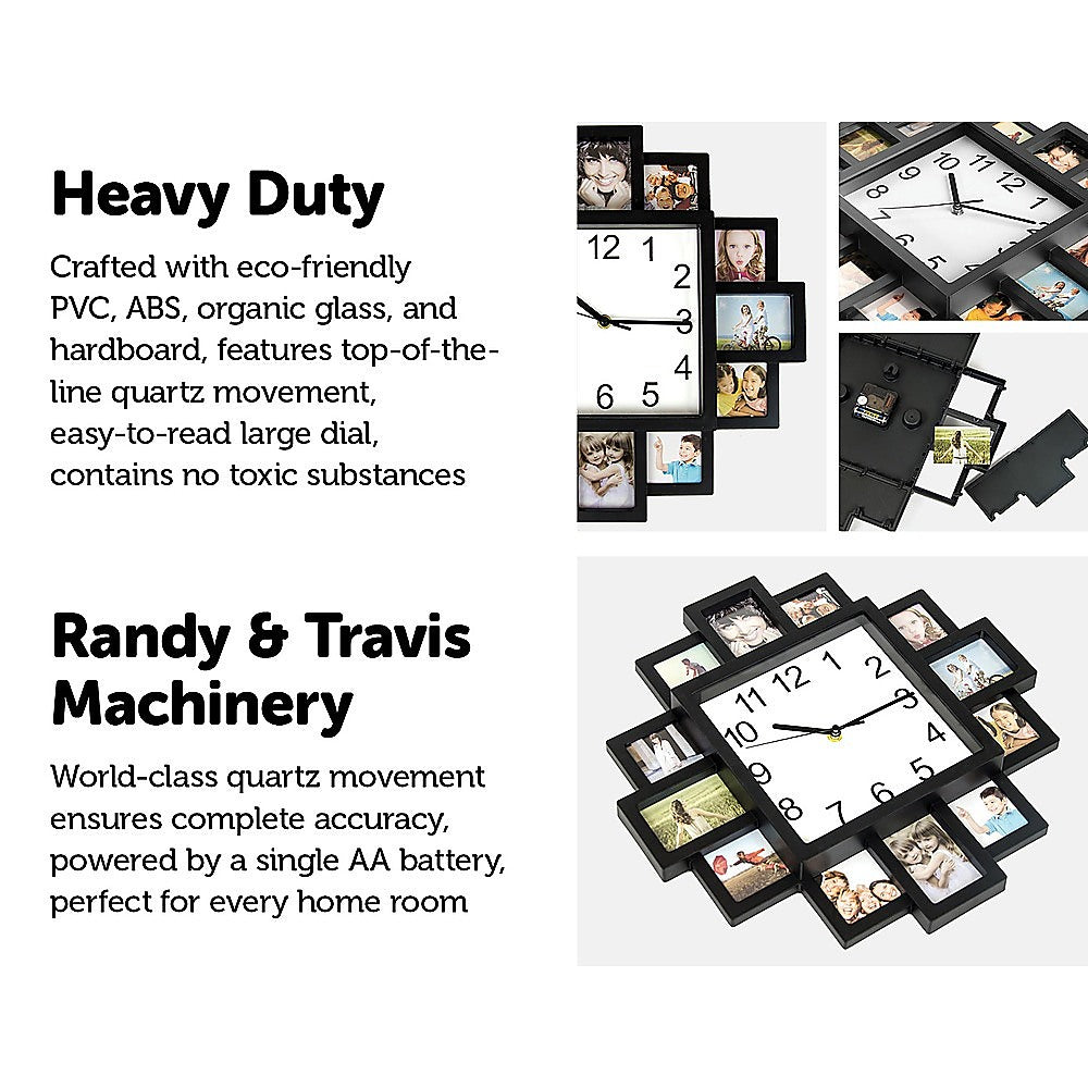 Keep your family and friends in mind during the day with this gorgeous photo collage wall clock by Randy Travis Machinery. Displaying 12 photos in an abstract sunburst design with the timepiece at the centre, this clock makes for a stunning display in any room. With both the photos and clock enclosed in black frames, this clock makes a dramatic statement on your wall. It's perfect for living rooms, rumpus rooms, bedrooms, or offices and makes a perfect gift for housewarmings, birthdays, holidays, weddings, graduations, and the birth of a new child.
