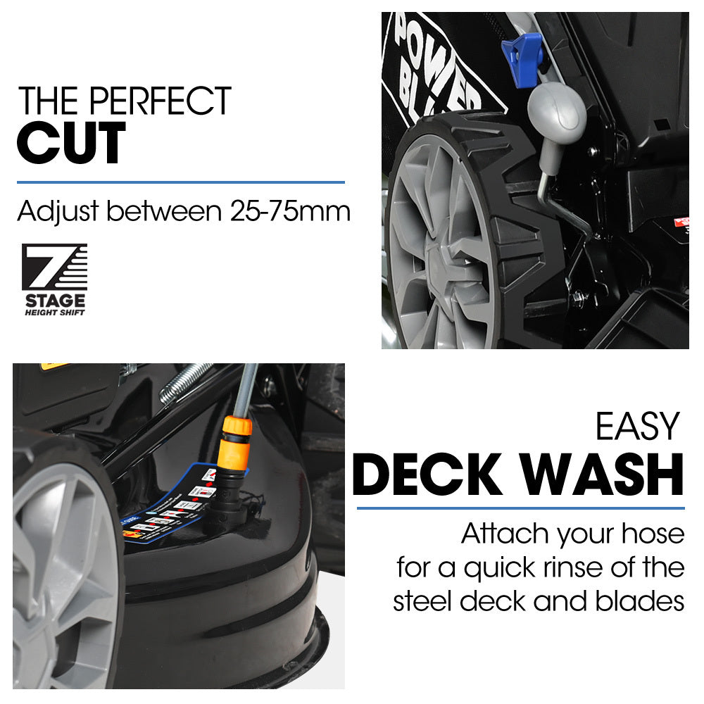 PowerBlade 22 224cc Self-Propelled Lawn Mower, Electric Start, 7 Height, Steel Deck, Deck Wash Port, OHV 4-Stroke Petrol - VS1000