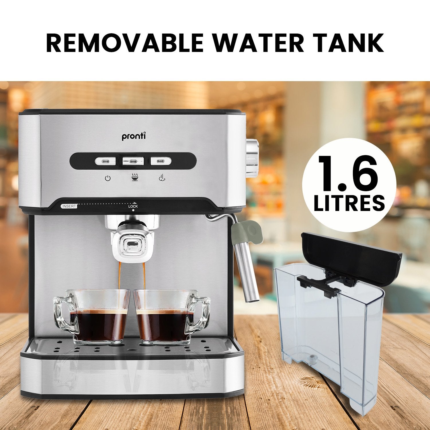 As for the pice de rsistance of this bundle, Pronti's high-end 1.6L espresso machine will definitely upgrade your morning with premium-quality coffee. With a built-in cup warmer and a removable 1.6L water tank, this impressive espresso machine will make morning brews look and feel easy and effortless. This set also includes a coffee spoon/tamper as well as a washable drip tray.
