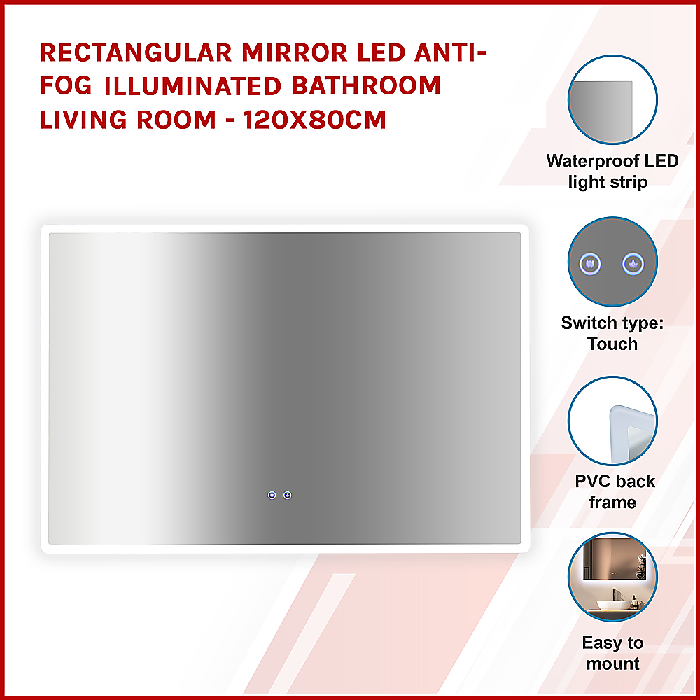 Rectangular Mirror LED Anti-Fog Illuminated Bathroom Living Room - 120x80cm