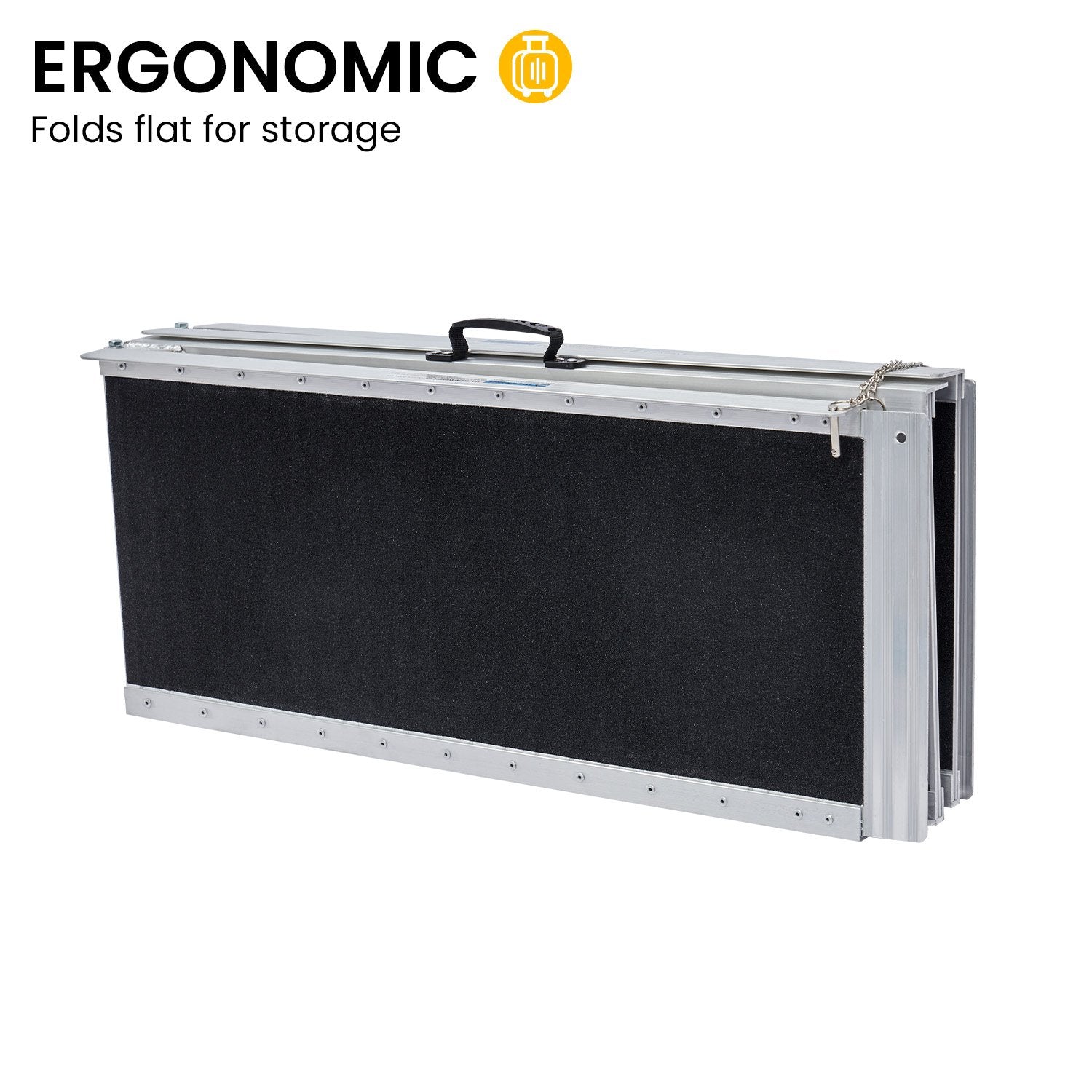 This portable aluminium wheelchair ramp is the ideal solution for climbing steps and kerbs or for getting into your vehicle. Its four-way folding design means you can carry it like a suitcase allowing for easy transportation, storage and usage both outdoors and at home.
