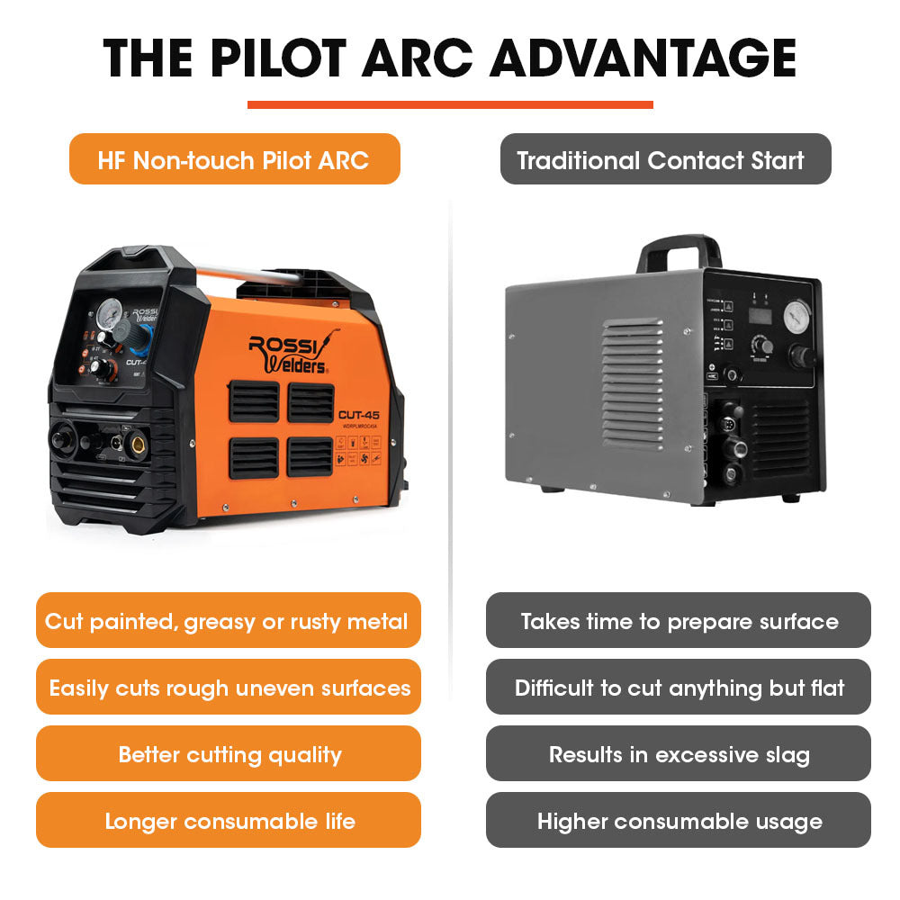 The Rossi Next Gen CUT-45 Pilot Arc Plasma Cutter is the latest innovation in high-power plasma torches. This powerful, lightweight inverter has true DC inverter technology to produce 98 volts up to 45 amps.