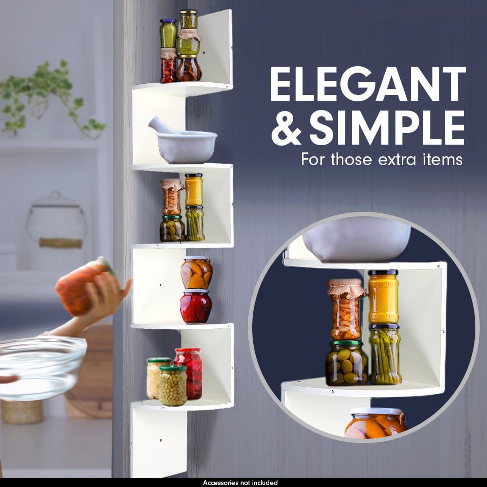 Decorative and functional zig-zag corner wall shelf with 5 shelves makes space utilisation possible from any corner. Creative design and space saving solution for small areas. Display collectables, photos, toys, awards, CD's, videos, decorative items and more.