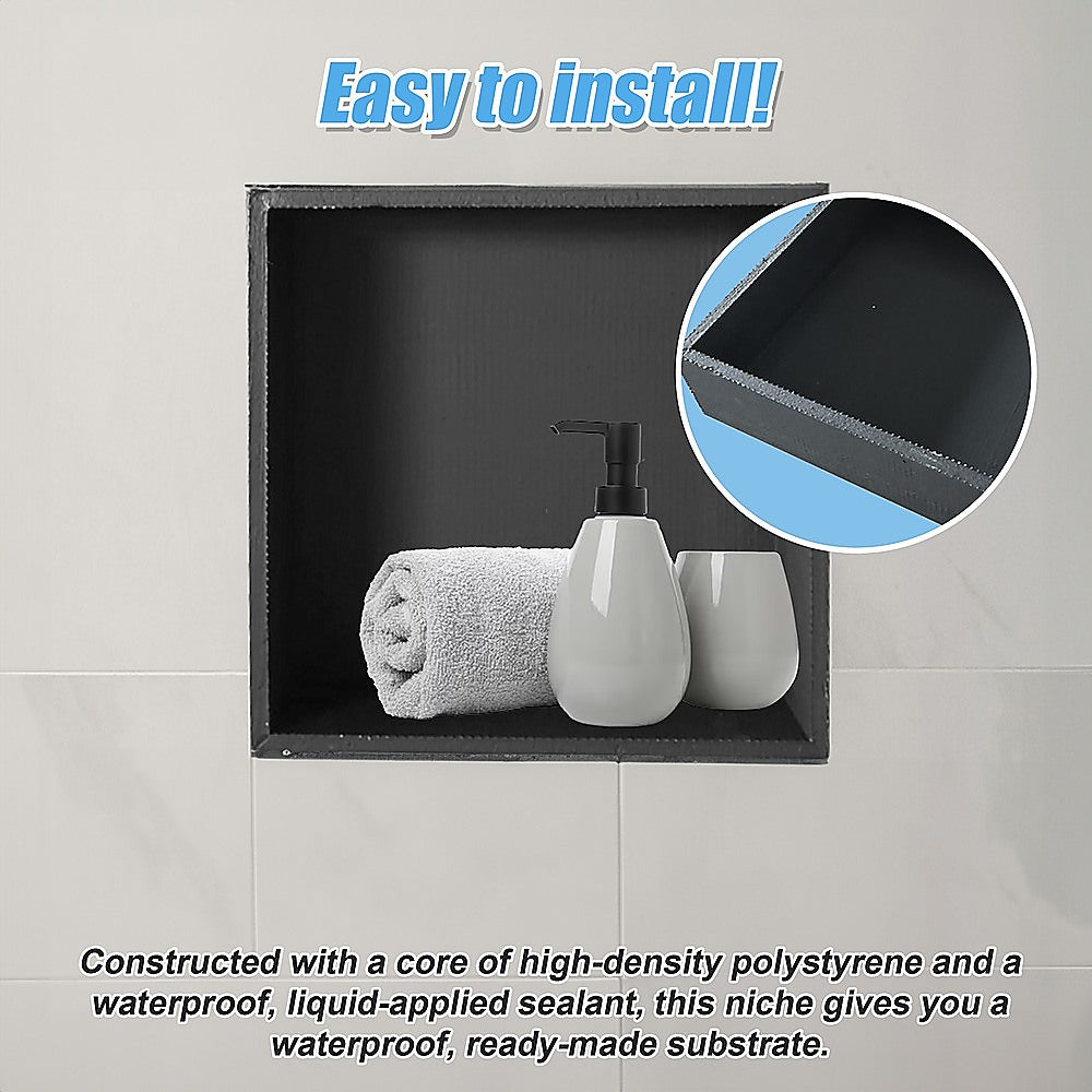 - Waterproof: Extremely water-resistant, this shower wall niche is perfect for areas prone to moisture or even immersed surfacesshowers, of course, but also bath surrounds, wet rooms, balconies, patios, garden water features, and external walls.
