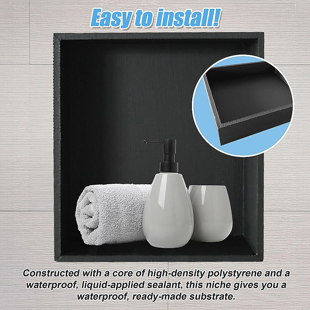 - Waterproof: Extremely water-resistant, this shower wall niche is perfect for areas prone to moisture or even immersed surfacesshowers, of course, but also bath surrounds, wet rooms, balconies, patios, garden water features, and external walls.